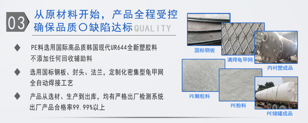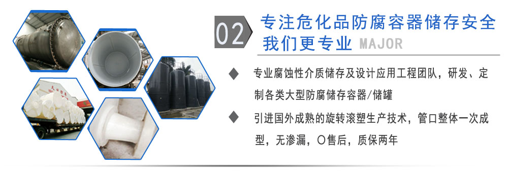 公司有鋼襯塑PE/PO、PE全塑、碳鋼、不銹鋼四大系列100多個(gè)品種,專注于常壓儲(chǔ)存容器生產(chǎn),其產(chǎn)品包括鋼襯塑儲(chǔ)罐管口一體成型PE儲(chǔ)罐碳鋼儲(chǔ)罐不銹鋼儲(chǔ)罐、反應(yīng)釜、攪拌罐、離子交換柱、鋼襯PE/PO儲(chǔ)罐塑料儲(chǔ)罐鹽酸儲(chǔ)罐硫酸儲(chǔ)罐等等。更大限度滿足廣大客戶的各種需求,同時(shí)可以根據(jù)客戶的需要加工定制各種防腐設(shè)備。